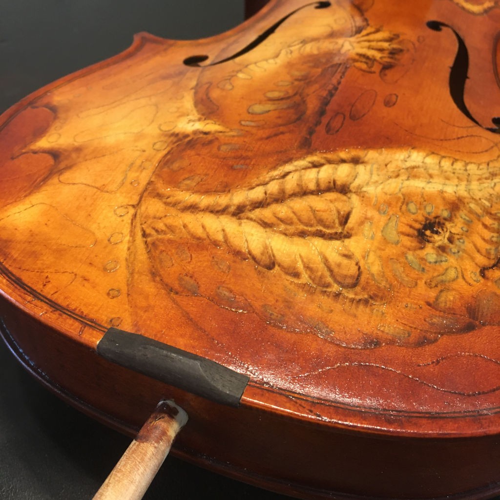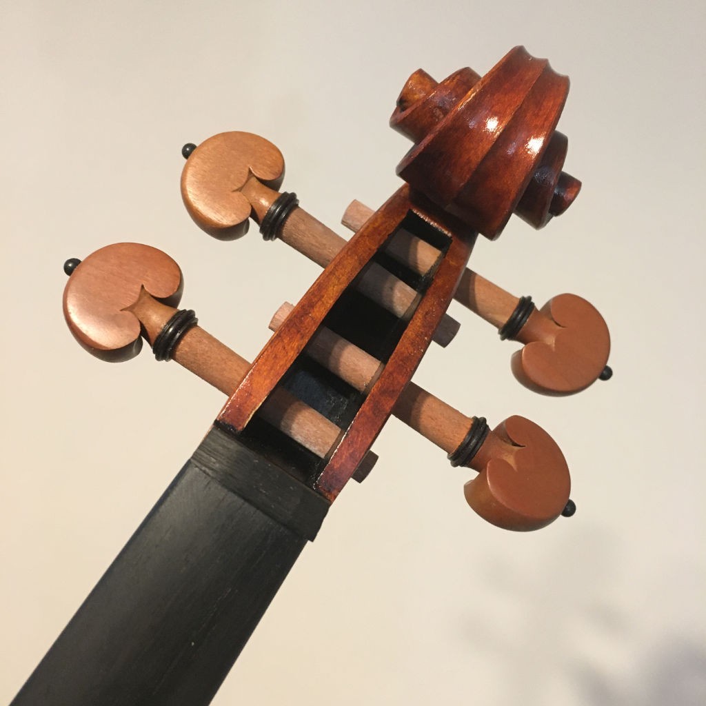 The colour has finished drying, and a final coat was applied. I painted the f-holes and the pegbox black. I cut the slot for the second nut (saddle nut), the fingerboard, and also the main nut. I reamed the peg holes to the proper angle and also the peg hole at the base. I am getting closer.